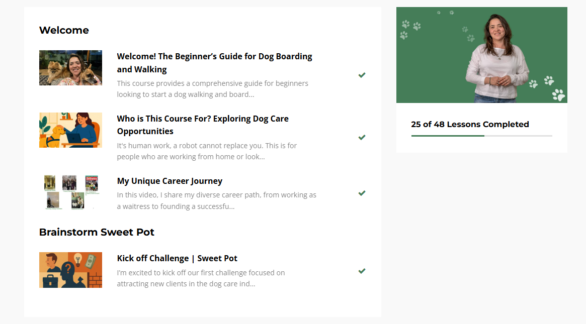 Our comprehensive program offers a series of short videos to guide you from novice to expert in professional dog care. Learn how to deliver top-quality dog walking and home boarding services from the comfort of your home. The complete program for dog boarding and group walks course